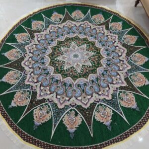 روفرشی گرد ۲*۲ مخمل زرکدار طرح خورشید ؛ جنس: مخمل زرکدار ( سطح روفرشی براق است) یکرو ریشه دوزی شده
