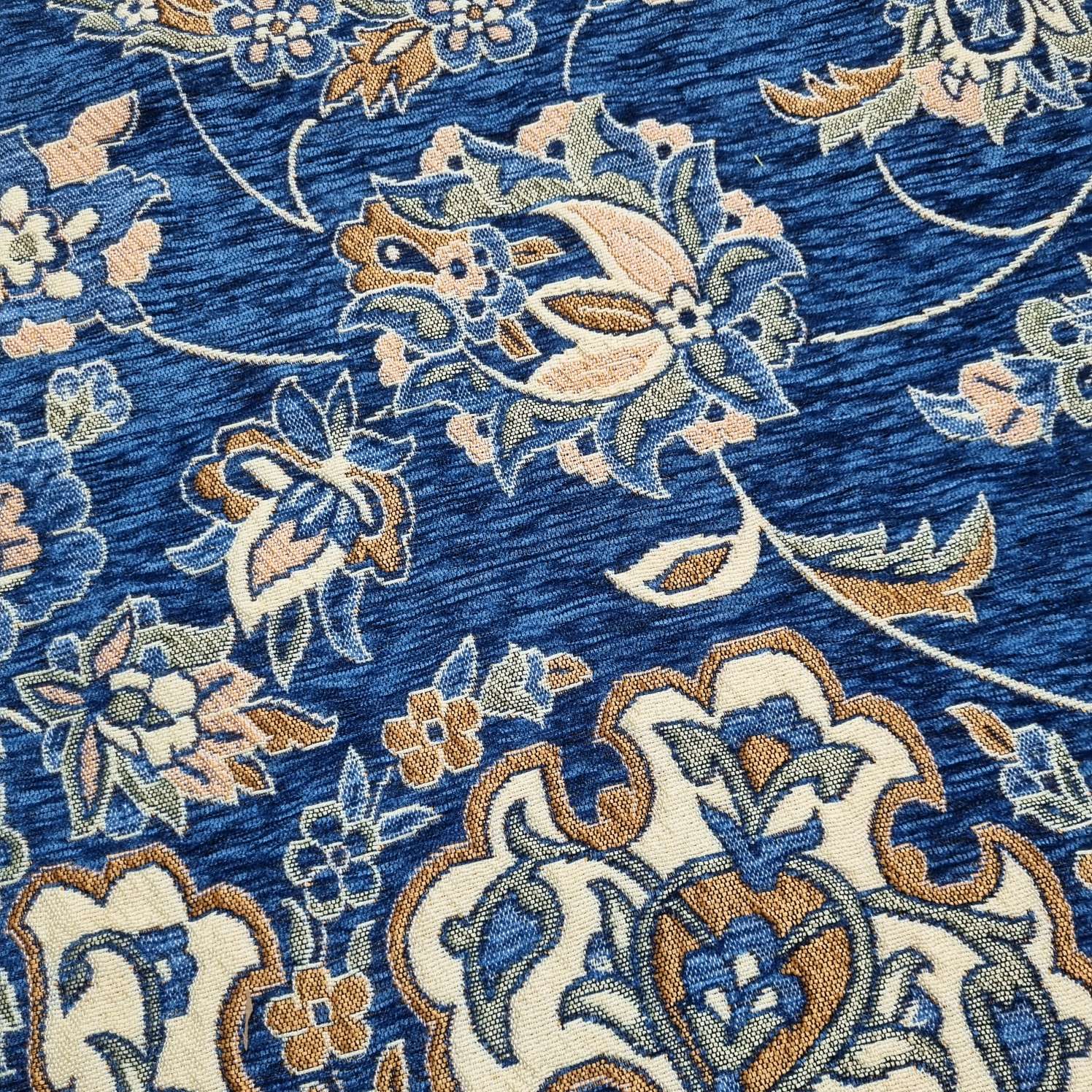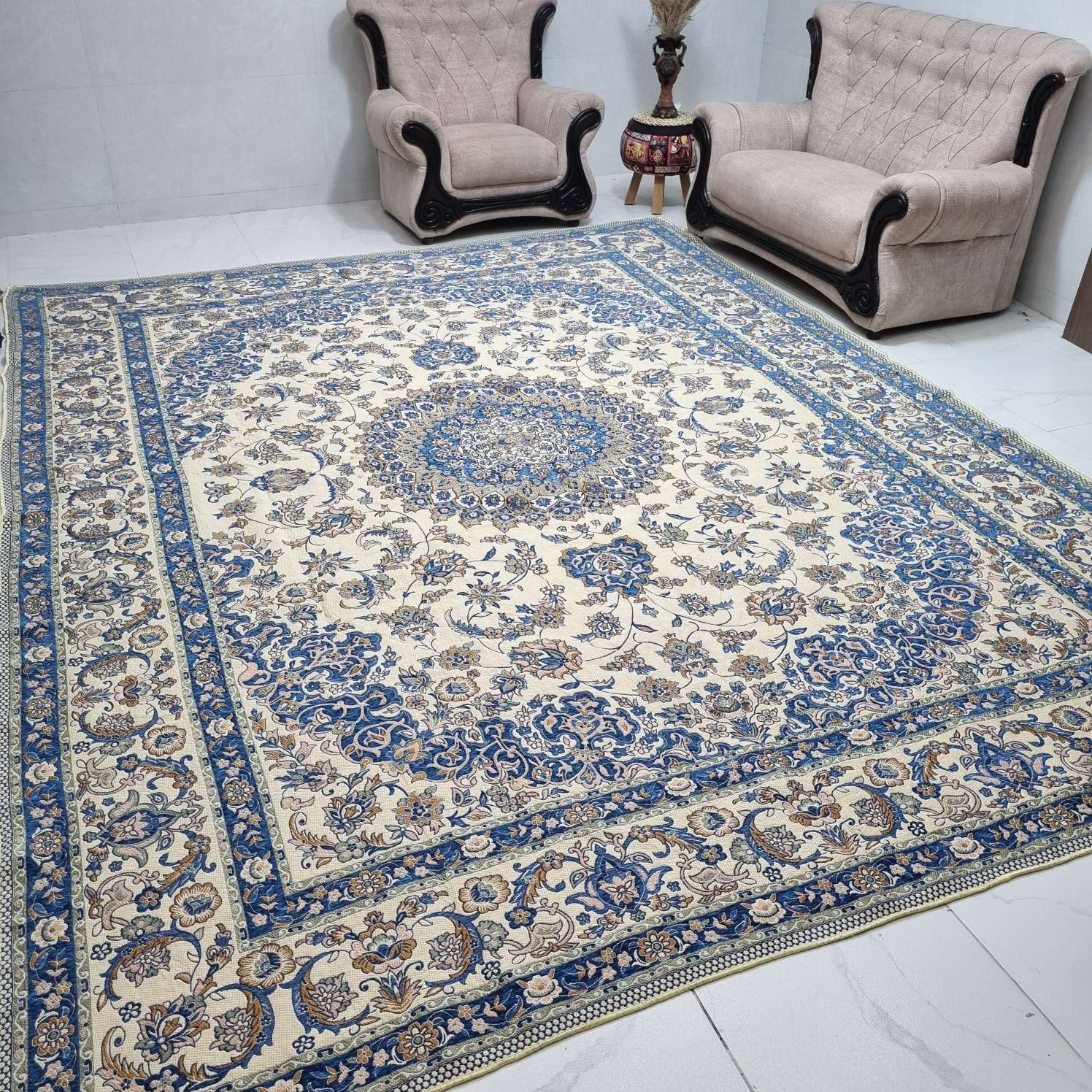 یک طرف آن زمینه آبی فیروزه است با مخملی بیشتر و طرف دیگر زمینه کرم است و غیر مخملی
