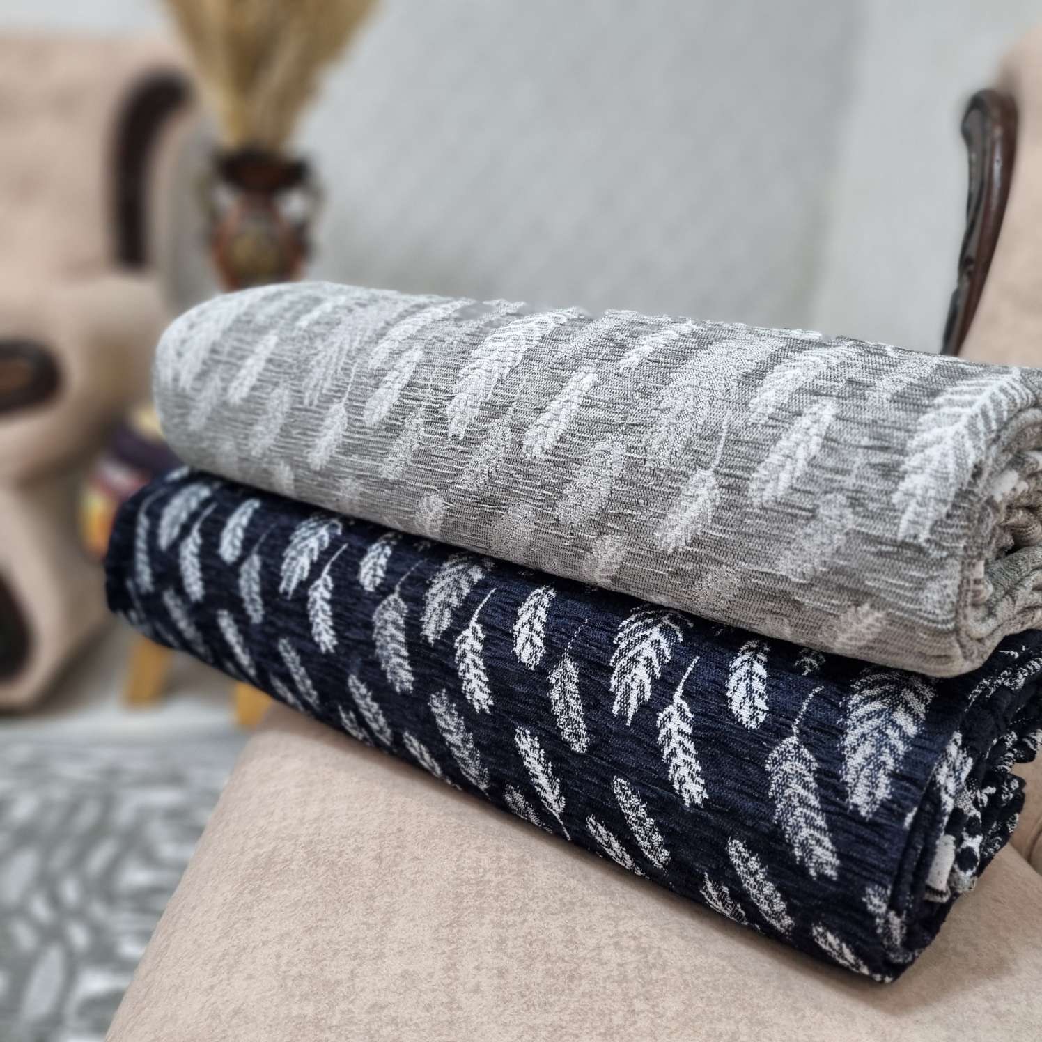 و طرف دیگه، زمینه سفید و برگ های سرمه ای یا طوسی است